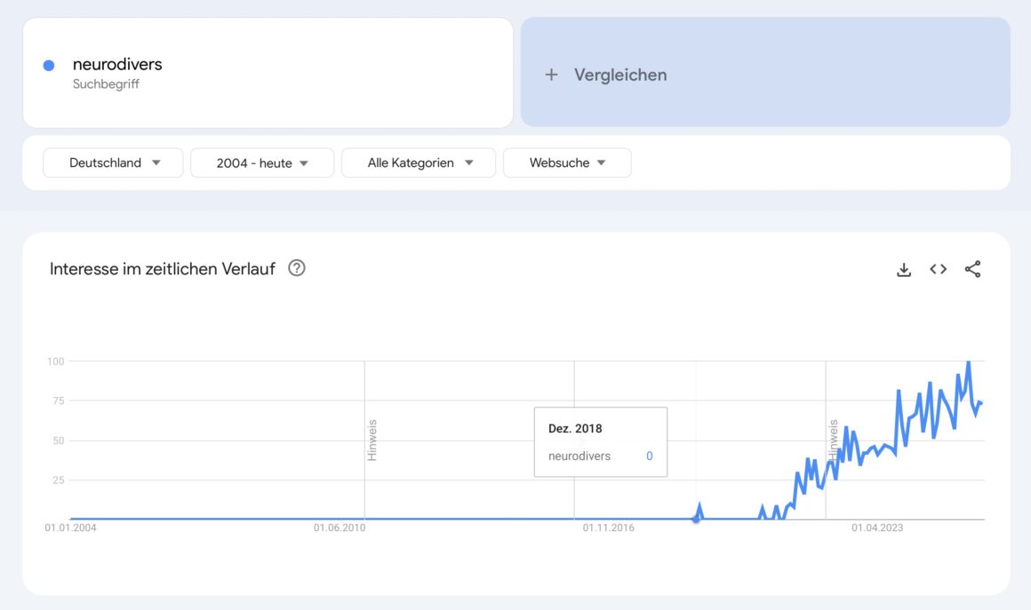 *Bei Bumble kann man neuerdings bei „Initiativen und Communities“ neben Black Lives Matter, Umweltschutz, Feminismus und weiteren auch Neurodiversität auswählen. Der Begriff „neurodivers“ wird laut Google-Trends erst seit 2018 geführt.