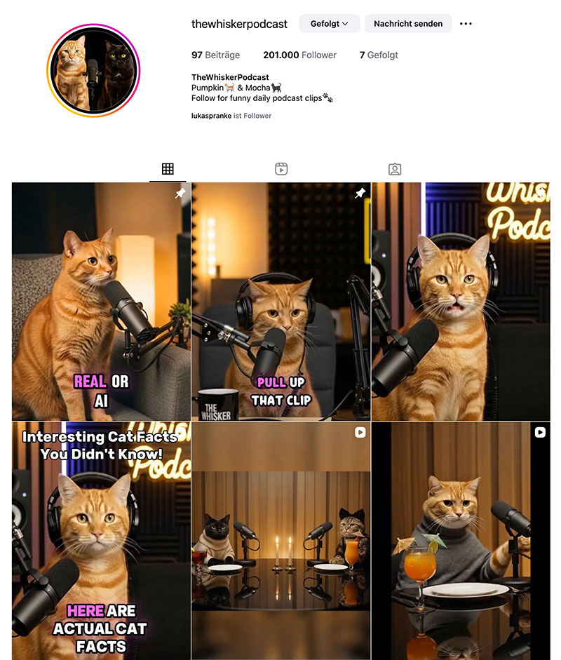 Wo wir schon dabei sind: Whisker Podcast auf Instagram: Zwei Podkatzer mit mitunter unterirdischem Humor, die sich gerne über ihre Humans lustig machen und selbst testen, ob Videos nun AI sind oder nicht. Ich bin ganz klar Team Pumpkin, wer bist Du?